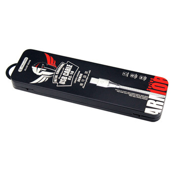 該款長(zhǎng)方形數(shù)據(jù)線翻蓋式鐵盒包裝采用0.23mm鍍錫馬口鐵制作,客戶可根據(jù)自身需求,選擇0.23-0.28mm的馬口鐵/磨砂鐵制作,若選擇磨砂鐵制作鐵盒可使得材質(zhì)表面有強(qiáng)烈的沙礫效果,在觸感上會(huì)變得更加有感覺。