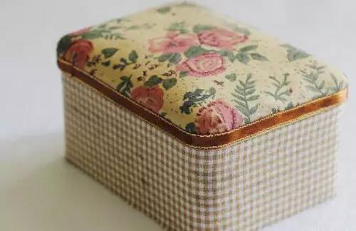 工具:剪刀、格子布、復(fù)古印花布、鋪棉、織帶、鐵盒、白膠
